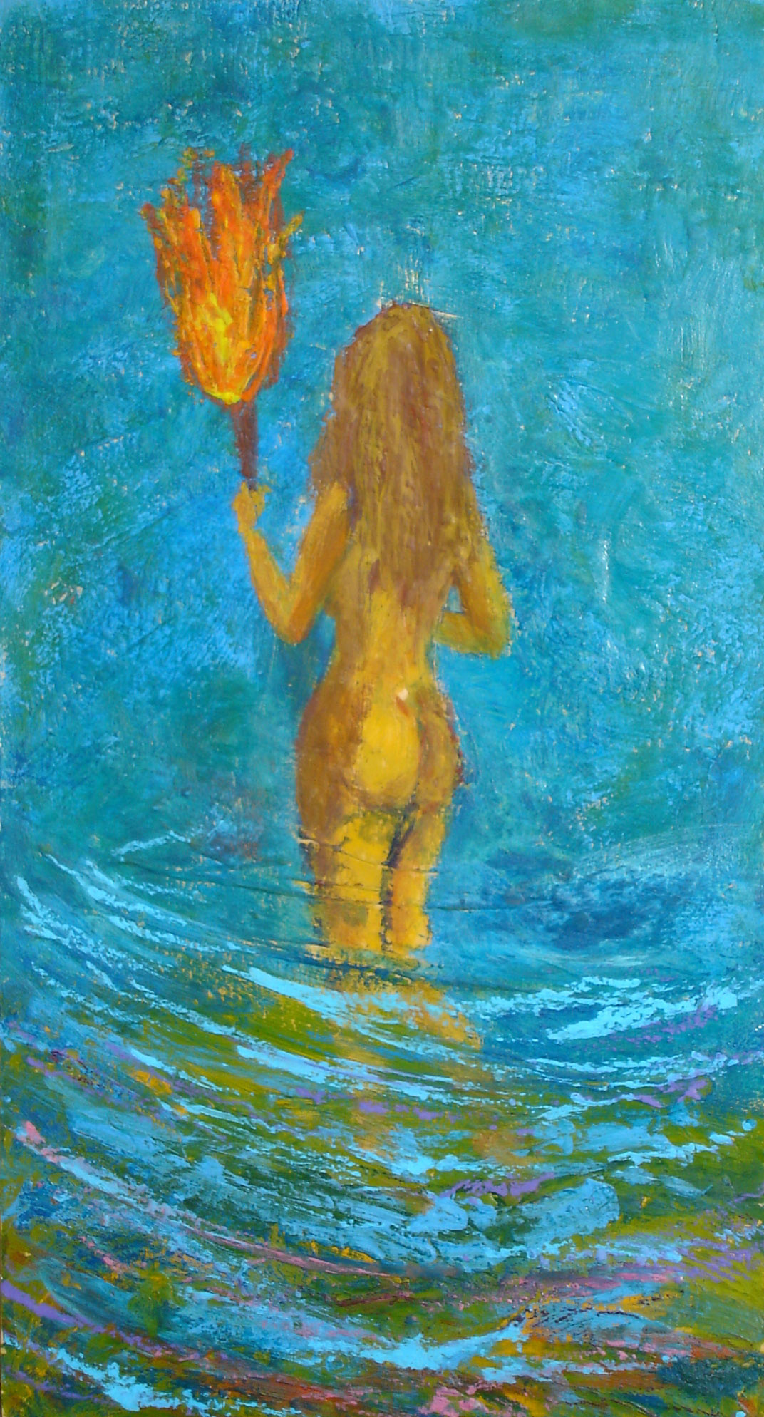 in the midst of the blue immensity. Her legs are glimpsed through the waves, while the waves gently caress her