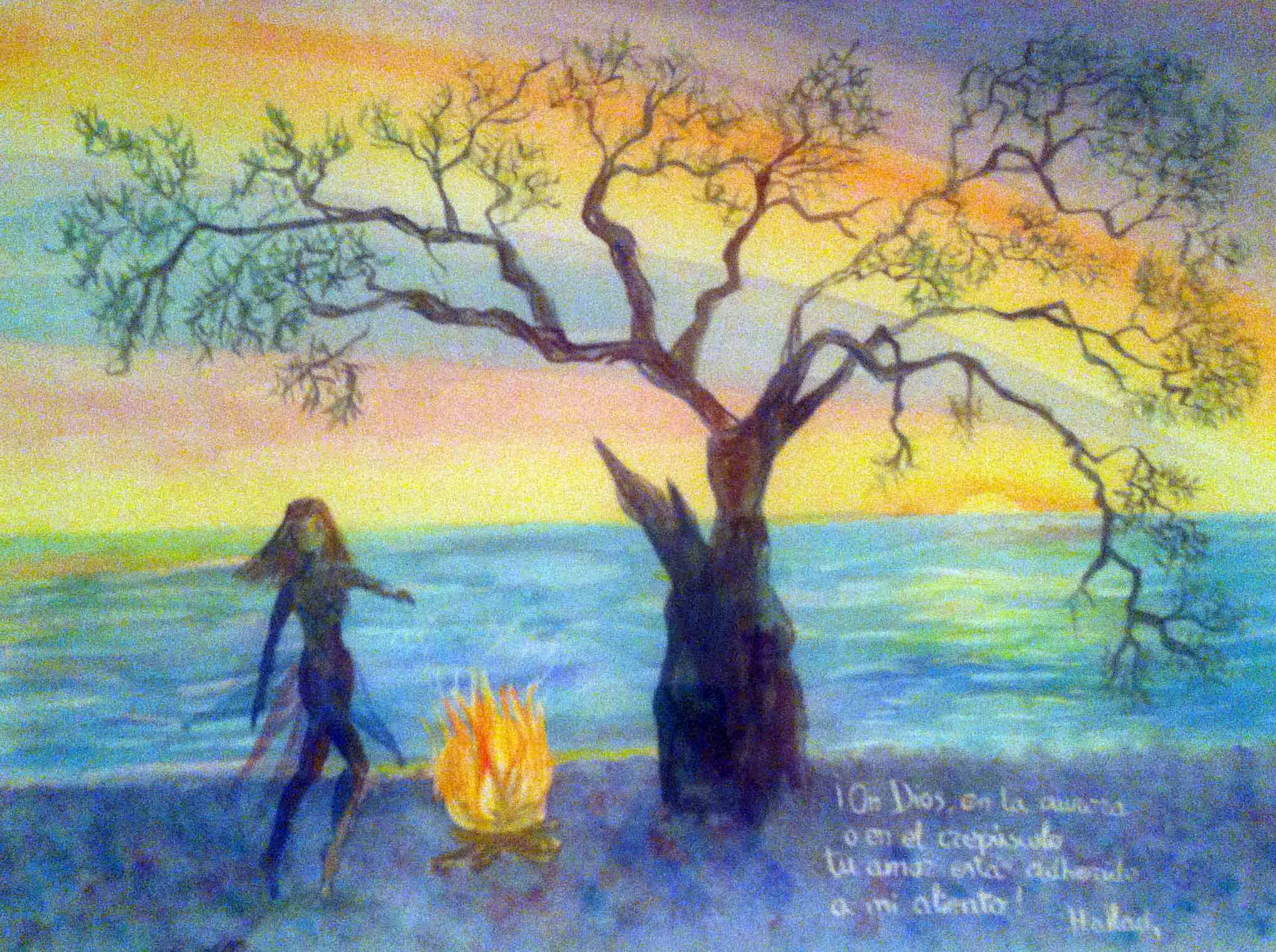 This watercolor work depicts a women dancing in the Twilight surrounded by the element fire, may it be with the fire or with the sun.
